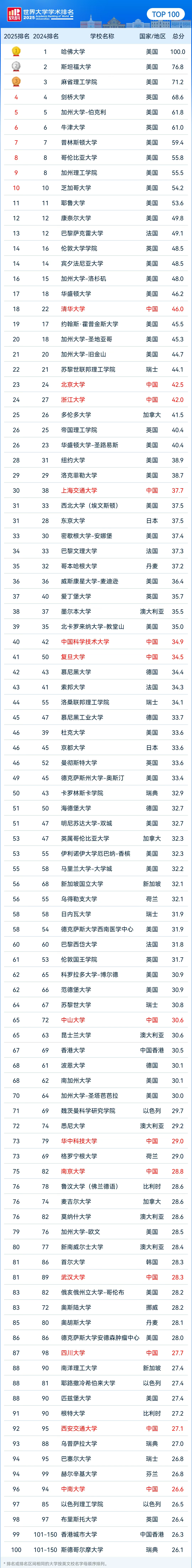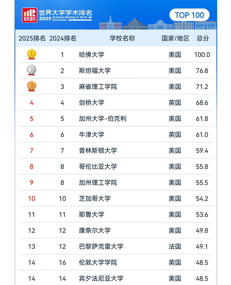 美国依旧有8所院校跻身前10,有37所院校进入前100。其中,哈佛大学、斯坦福大学、麻省理工学院占据前3,与去年排名保持一致。