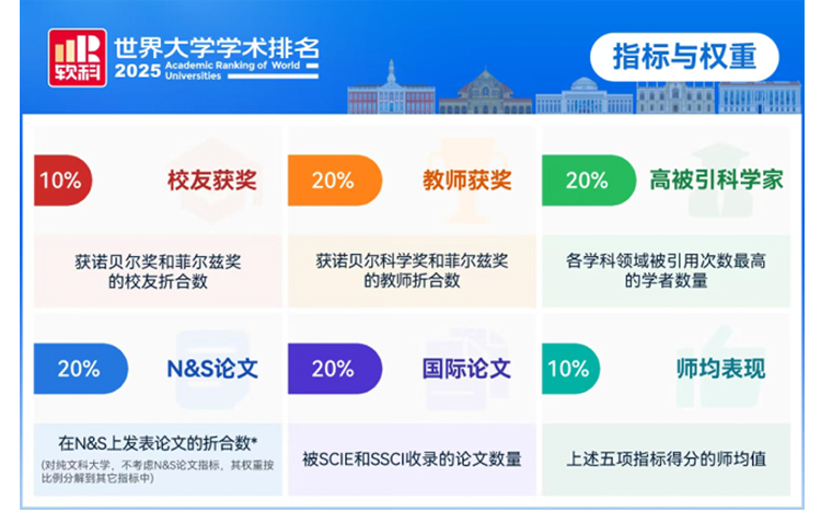 软科世界大学学术排名是全球最具影响力和权威性的大学排名之一,在世界各地被广泛媒体和大量引用,许多国家政府和大学以AR软科世界大学学术排名以评价方法的监测、透明和稳定着称,全部采用国际可比的监测指标和第三方数据,包括获得诺贝尔奖和菲尔兹奖的校友和教师数、科睿唯安高被引科学家数、在《Nature》和《Science》上发表的论文数、被Web 的科学科学引文索引(SCIE)和社会科学引文索引(SSCI)收录了论文数量、师均学术表现等。软科世界大学学术排名每年全球大学排名超过2500所,发布前1000所大学