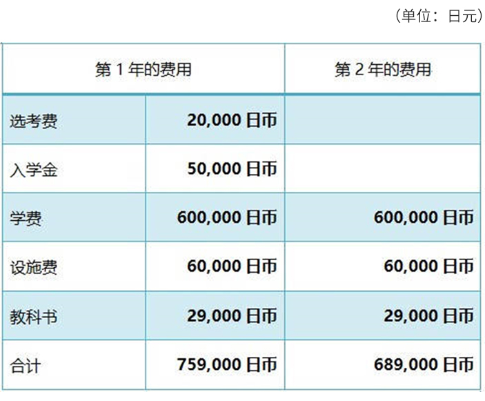 第一年的收费合计为75.9万日元,约合人民币3.8万元人民币。第二年不需要缴报名费和入学金,约合人民币3.5万元。 两年共计花费7.3万元左右。