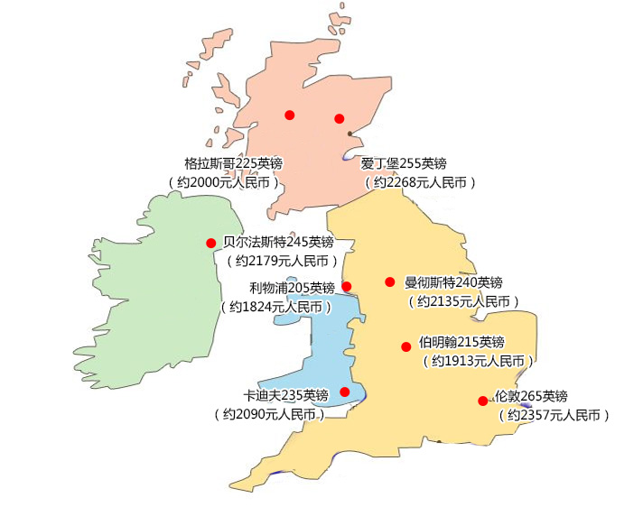 机票 单程机票含税价格:约3500-8000人民币不等,一般而言7-9月高峰期赴英机票较高,若接受第三方城市中转不直飞, 机票价格可能略为便宜1000-2000元。